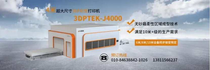 该设备突破传统加工尺寸限制,最大可成型4米的砂型。并创造性的采用了无砂箱柔性区域成型技术,破除了设备成型尺寸越大,设备价格越昂贵的现象,4米的设备仅为2米设备的价格,以更低的单位成本和更短的交付时间,经济高效地实现超大尺寸的砂型制造,并可根据用户需求按需定制扩展打印平台,满足10米+级的生产需求(6米/8米/10米设备已在同步接受预定)。同时,公司提供开源材料工艺,可针对用户按需调整;配套高性能树脂粘结剂、固化剂、清洗剂,保证成型质量和稳定性。