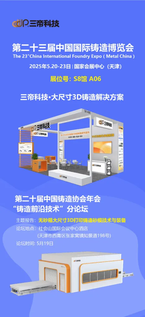第23届中国国际铸造博览会即将于2025年5月20日在天津国家会展中心(天津市津南区咸水沽镇国展大道888号)举办,北京w66给利老牌科技股份有限公司(以下简称“w66给利老牌科技”)将携大尺寸3D铸造解决方案参展。