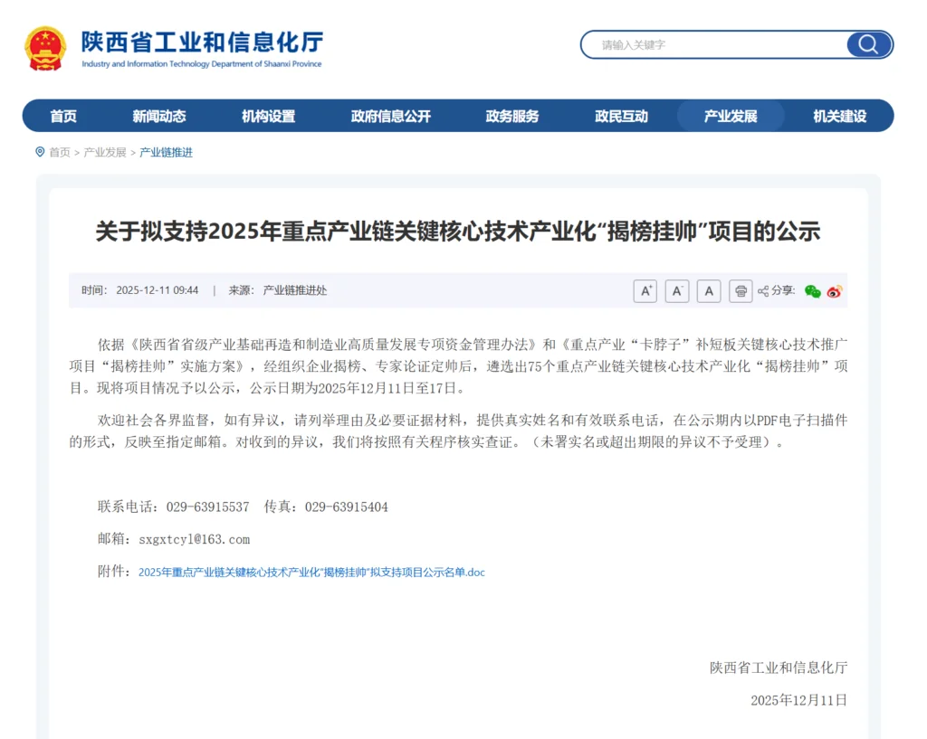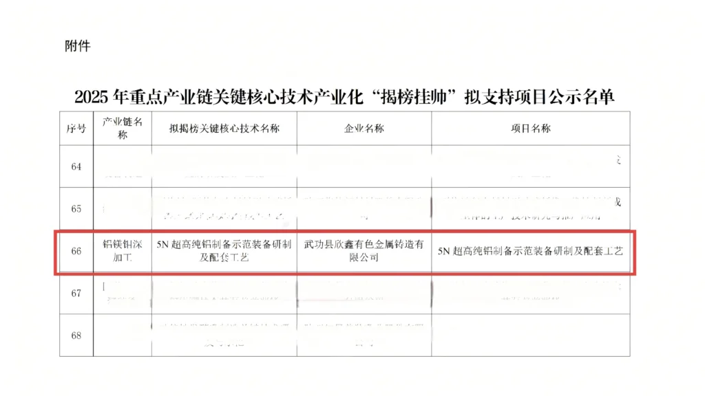 Gần đây, bởi Công ty Cổ phần Công nghệ San Di (tên viết tắt là "San Di Technology")Công ty TNHH Đúc kim loại màu Xinxinyu, huyện Wugong(viết tắt là "Xinxin Casting") và Đại học Công nghiệp Tây An (viết tắt là "Xi'an University of Technology") đã cùng nhau nộp đơn đăng ký dự án "Phát triển thiết bị mẫu và quy trình hỗ trợ cho sản xuất nhôm siêu tinh khiết 5N", và dự án này đã được chọn vào danh sách các dự án được đề xuất hỗ trợ trong chương trình "Gọi tên và chỉ định" về công nghiệp hóa công nghệ lõi quan trọng của các ngành công nghiệp chủ chốt tỉnh Thiểm Tây năm 2025 (viết tắt là "Dự án"). Kế hoạch này nhằm giải quyết những điểm yếu về công nghệ trong các ngành công nghiệp trọng điểm, thông qua việc triển khai các công nghệ cốt lõi quan trọng một cách có mục tiêu, thúc đẩy công nghiệp hóa các công nghệ cốt lõi quan trọng.